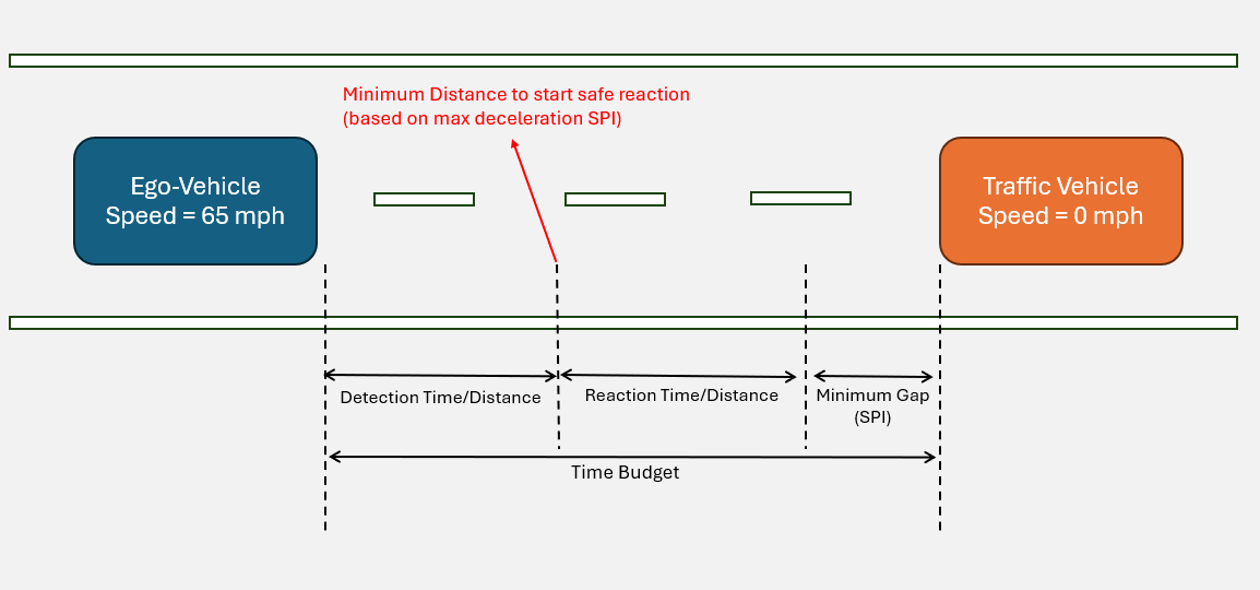 And the above leads to the question, at what point does the SDT need to detect the stopped vehicle such that it can start decelerating at the minimum distance to safely execute longitudinal deceleration to stop at a safe distance?